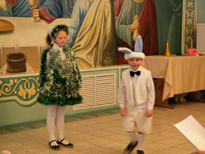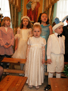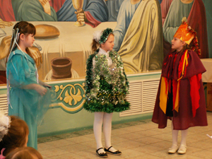 Вова: Я смотрел сценку, которую подготовили в нашем воскресной школе. Мне нравились все актёры этой сценки, но больше всего Зайчик, Елочка, Огонь и Вода. Все участники искали место, где родился Христос, и хотели помочь ему в эту первую Его ночь на земле. Даша: Я очень люблю Рождество. В этот день родился Христос. В храме было красиво и пахло ёлками. А перед храмом в монастыре стоял вертеп из ёлок. Он светился от огоньков, и в нём была икона. Мне понравился концерт, особенно сказка о ёлочке.