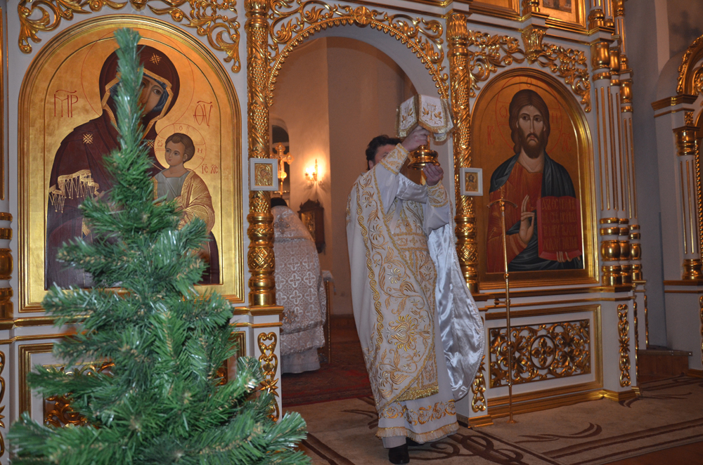 Христос раждается — славите! Христос с Небес — срящите! Христос на земли - возноситеся! Пойте Господеви, вся земля, и веселием воспойте, людие, яко прославися |